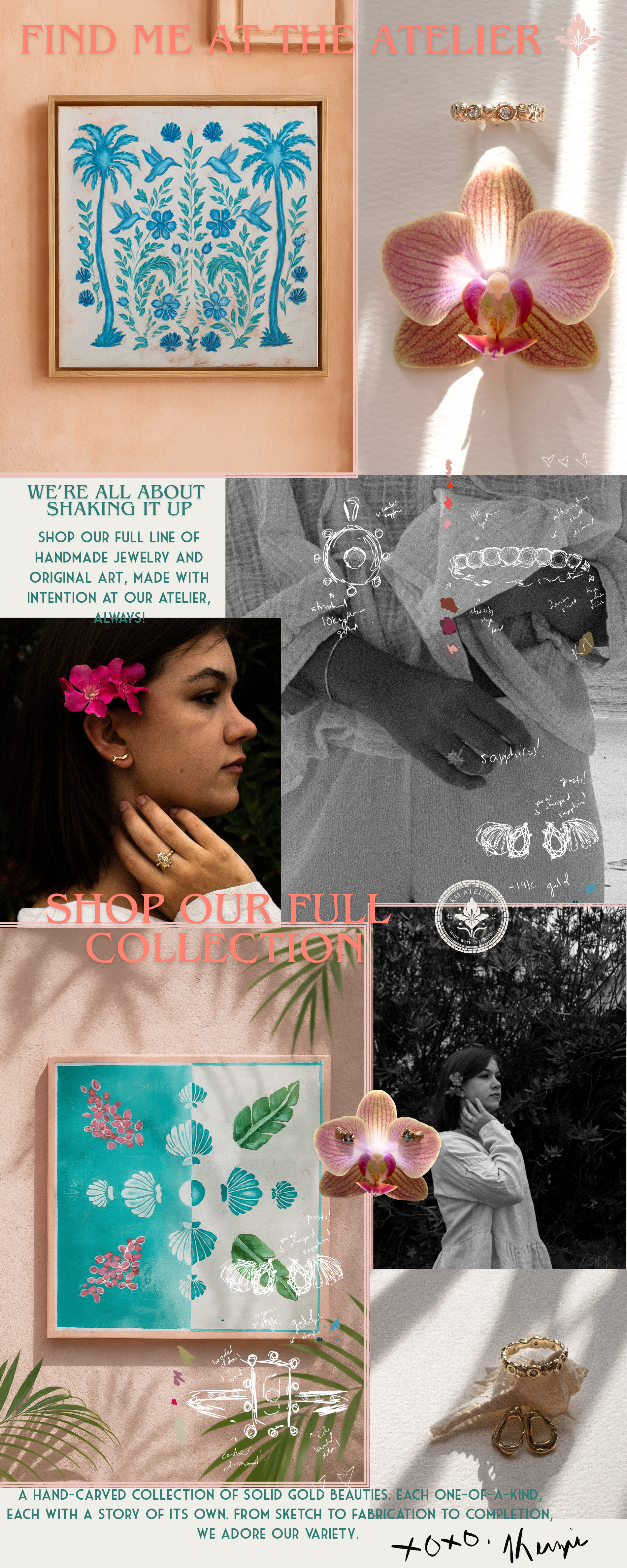 We are a jewelry design / goldsmith studio where pieces are conceptualized, sketched, then fabricated, all in one place. Our mission is to make high end jewelry, and the design process, and interactive experience for the customer where they can witness and be apart of the entire process. Our brand ethos is MADE WITH INTENTION and we strive to unite intentional care with authentic artistry in the jewelry atmosphere. From beautiful designboards to messy workbenches, we do it all.