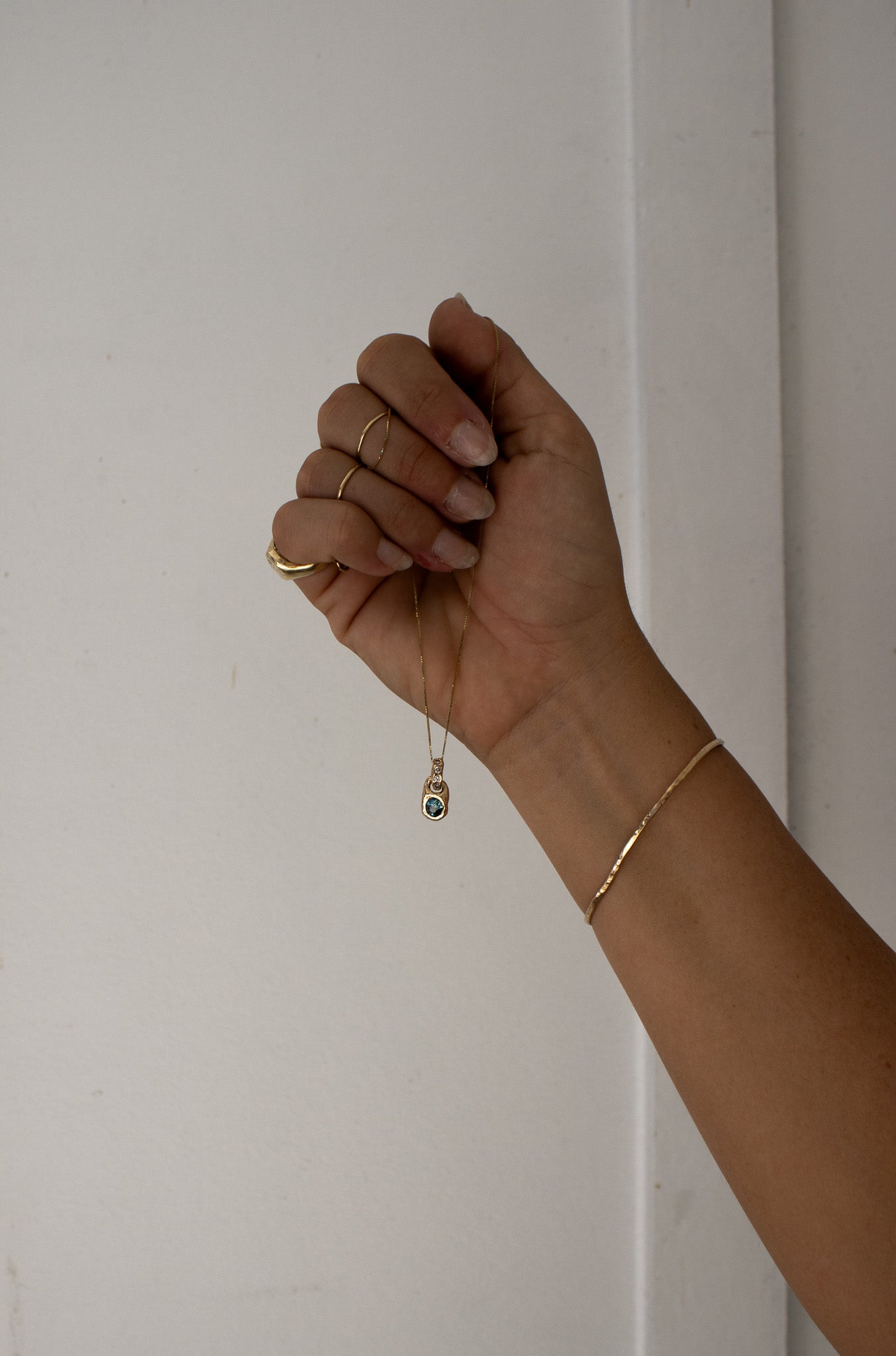 Our newest and sparkliest! The KM Double Sapphire Pendant is just as creative as it is unique, with a two part charm hung delicately on a sturdy venetian chain. Both elements were hand-carved individually, cut open and looped through each other and then soldered shut to create a two-part pendant that holds little diamonds up top and a gorgeous authentic Madagascar bright blue sapphire underneath. A true unique stunner!