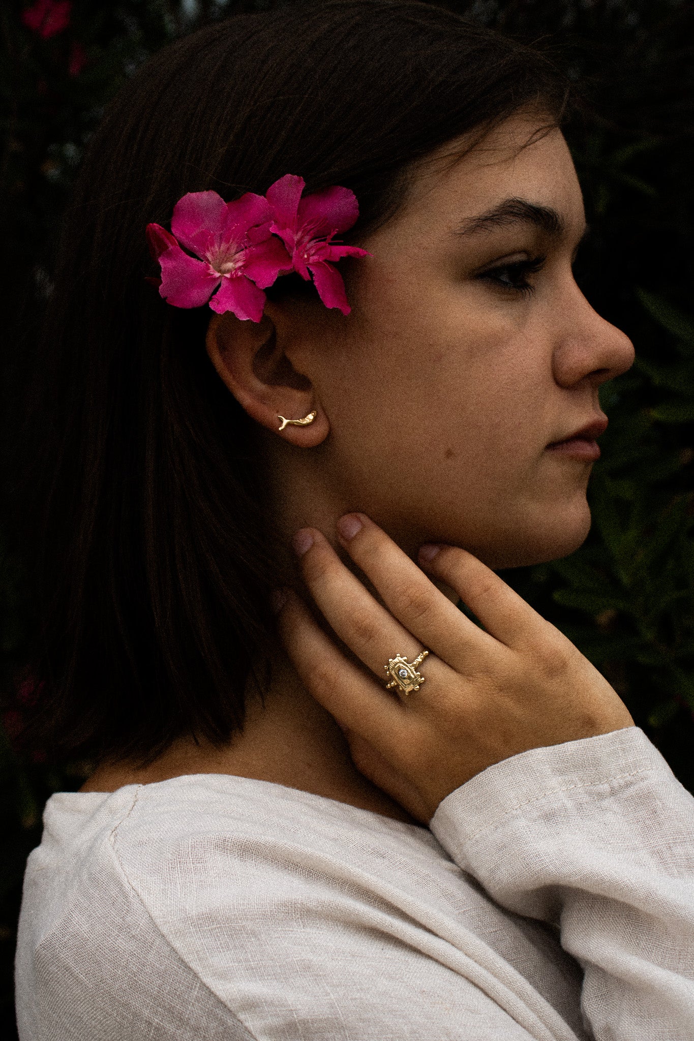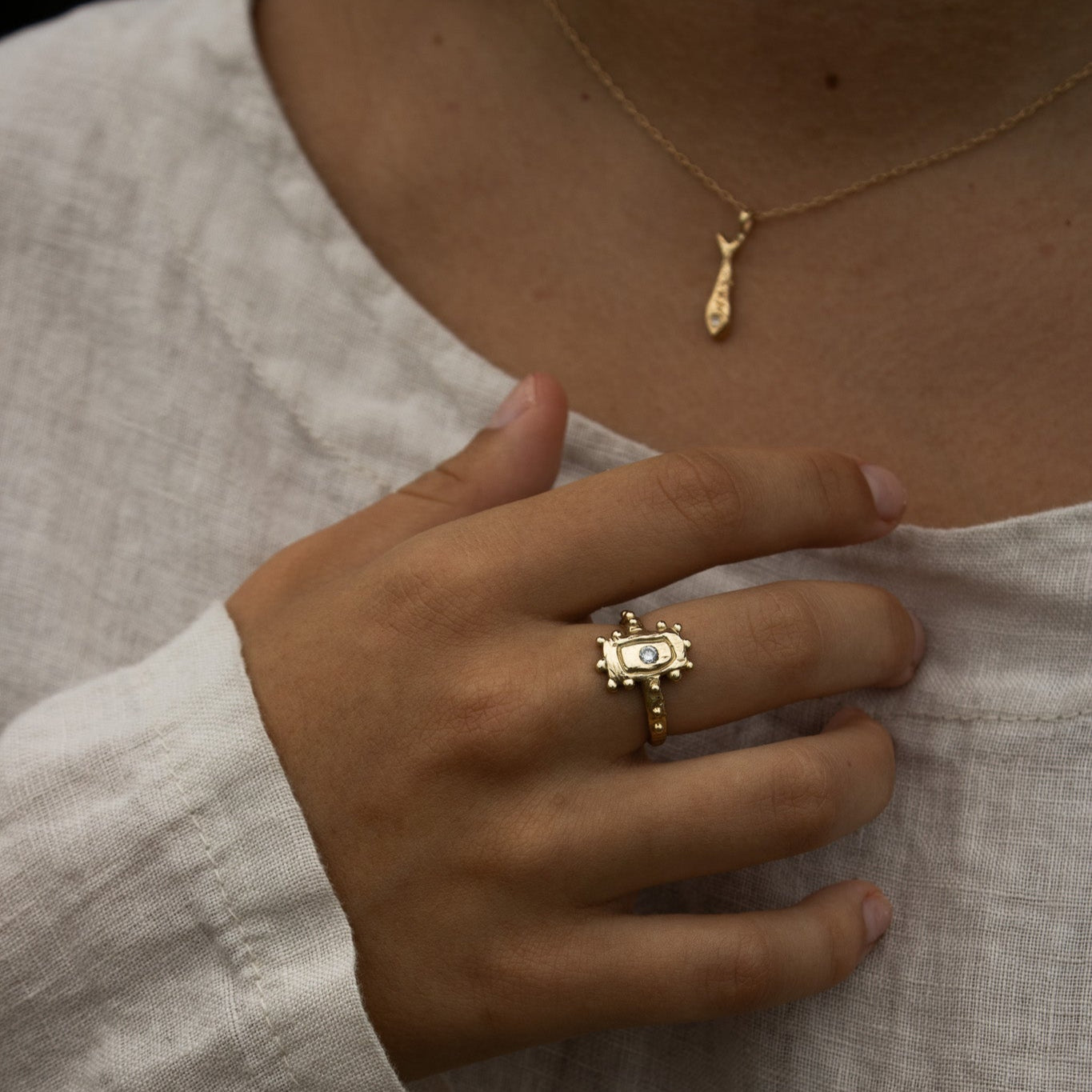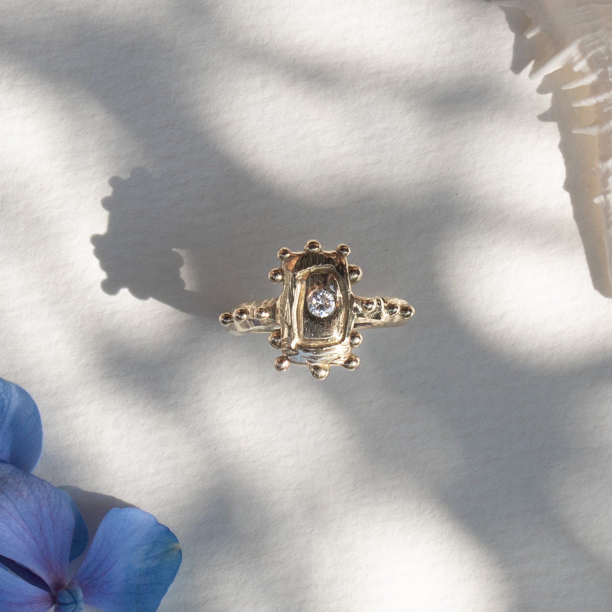 Our one-of-a-kind KM Pompeii ring is one of our most unique creations yet. Its beautiful hand-carved rectangular structure paired with side dotted detail and a center diamond give it the most intricate final look. A statement piece!