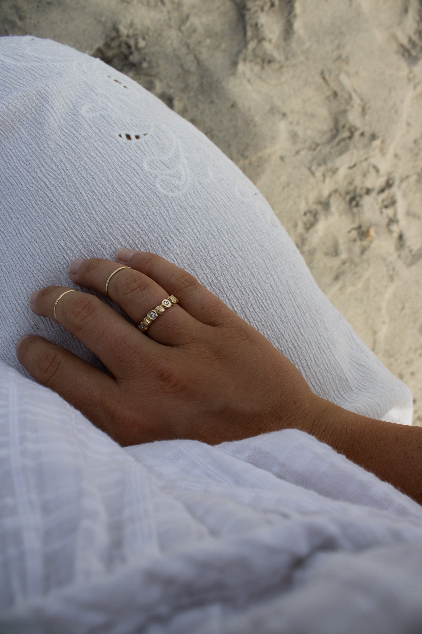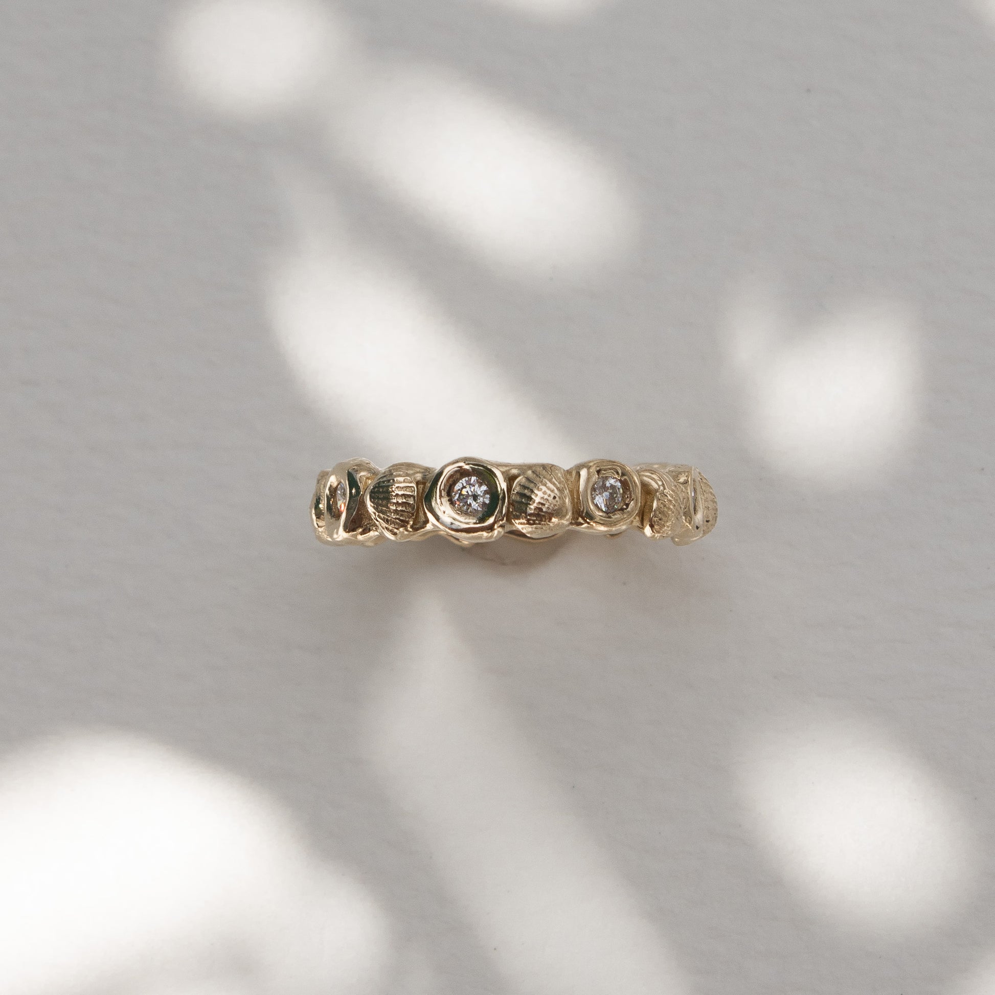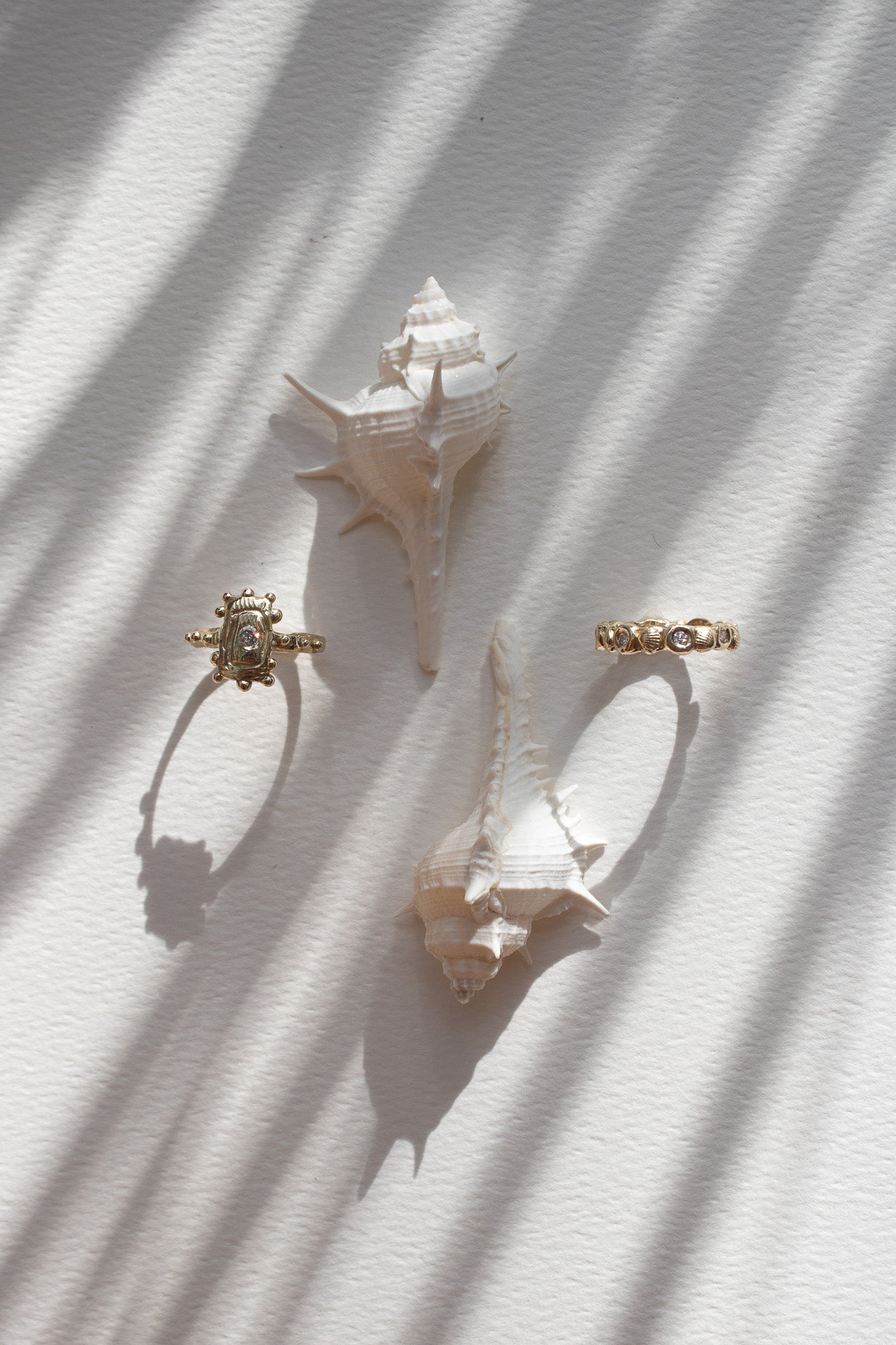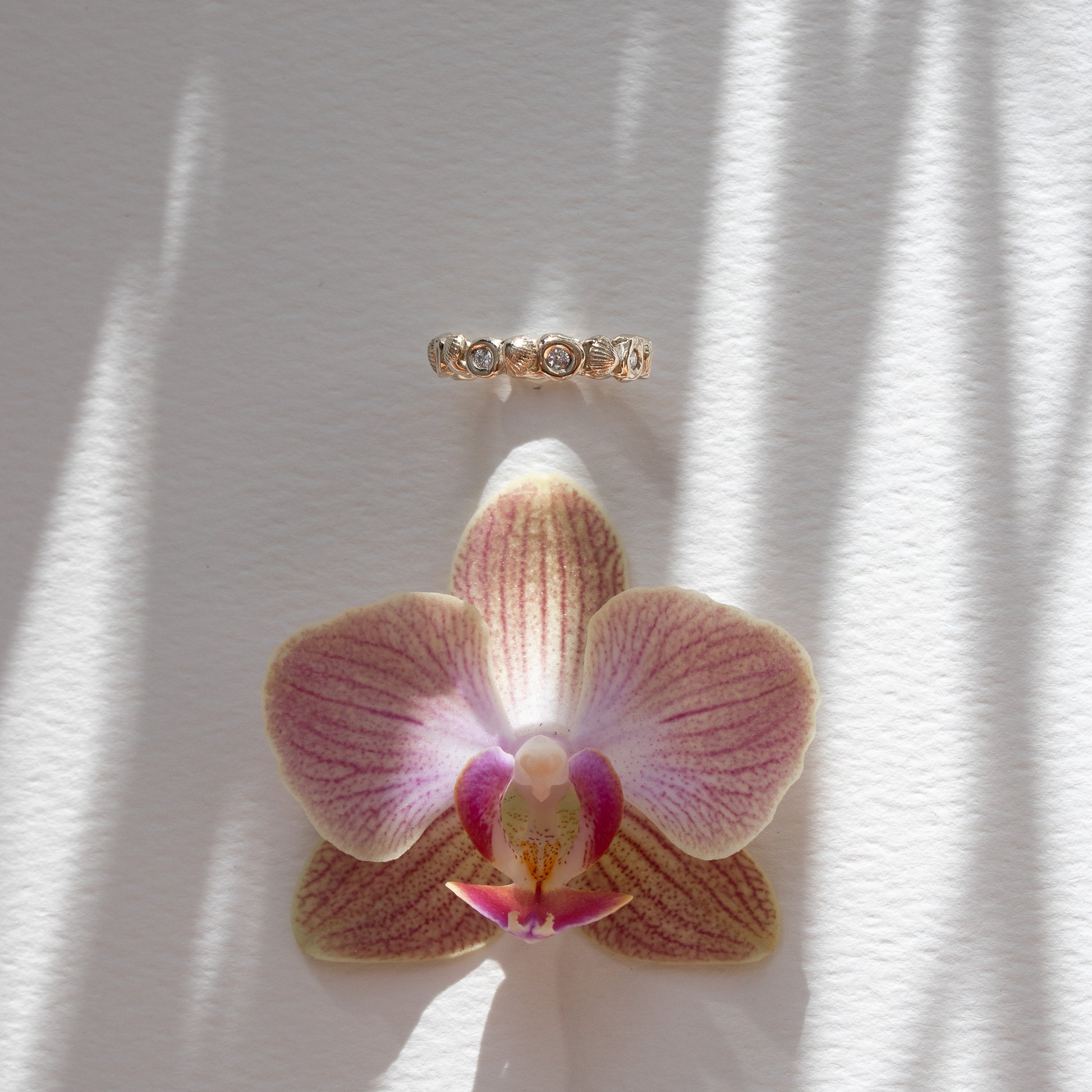 Our all-time favorite, the KM Scallop Eternity Band adds a unique twist to the everyday eternity style band. Hand-carved scallop shells paired with alternating bezel set 2mm diamonds make this ring truly a one-of-a-kind option to add to your collection.