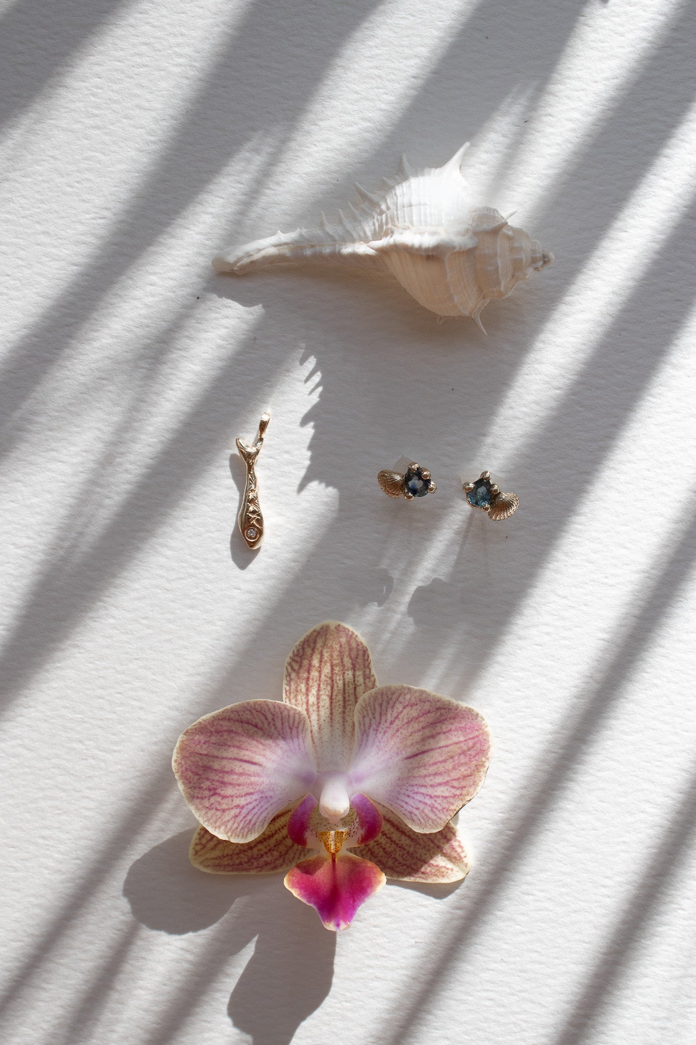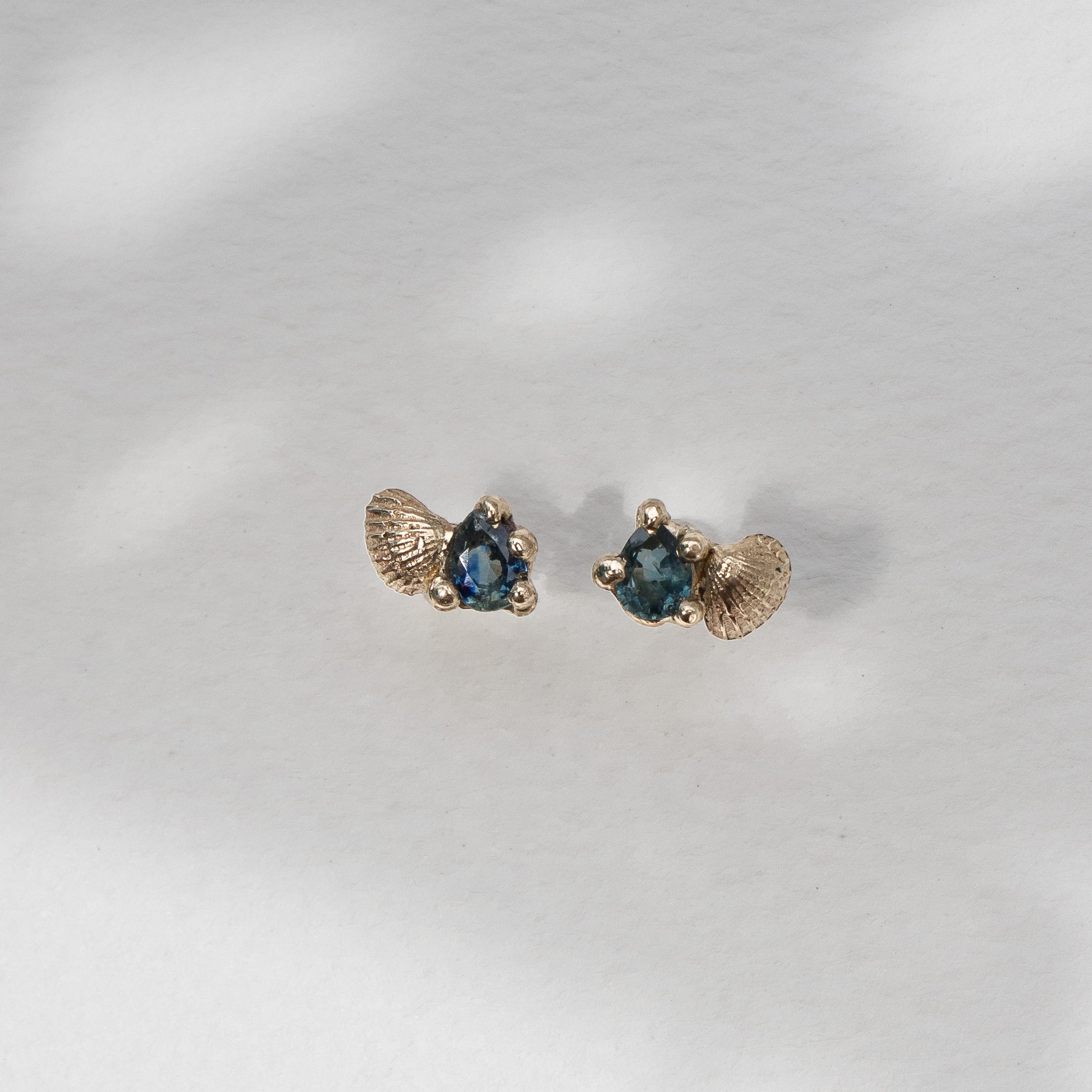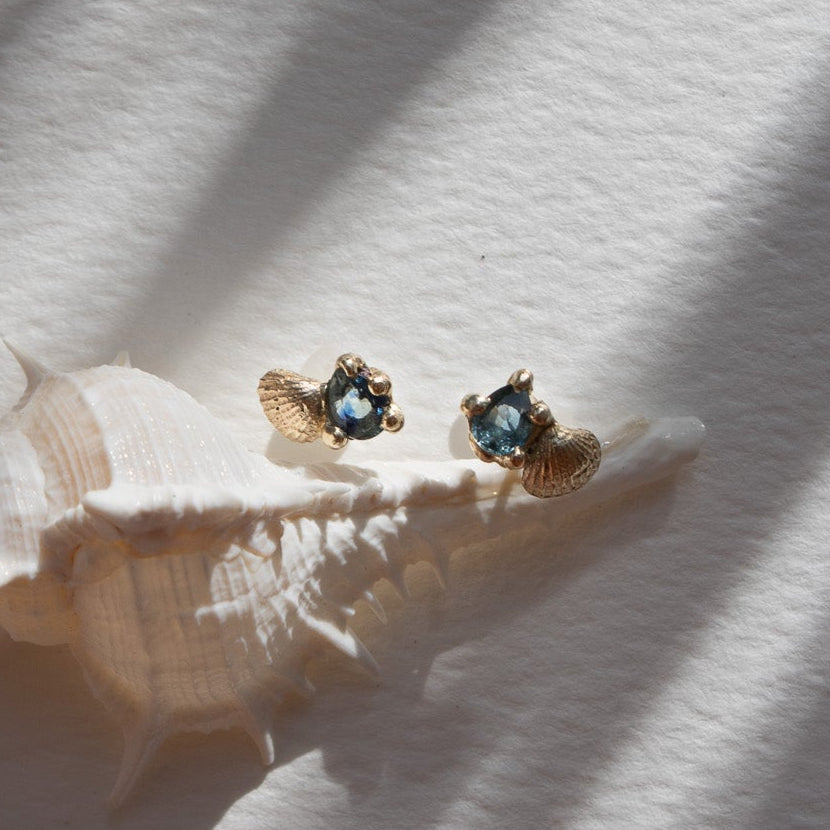 These one-of-a-kind signature studs are our absolute favorite. Hand carved scallop shells are paired perfectly with pear shaped Madagascar teal sapphires. Truly unique!